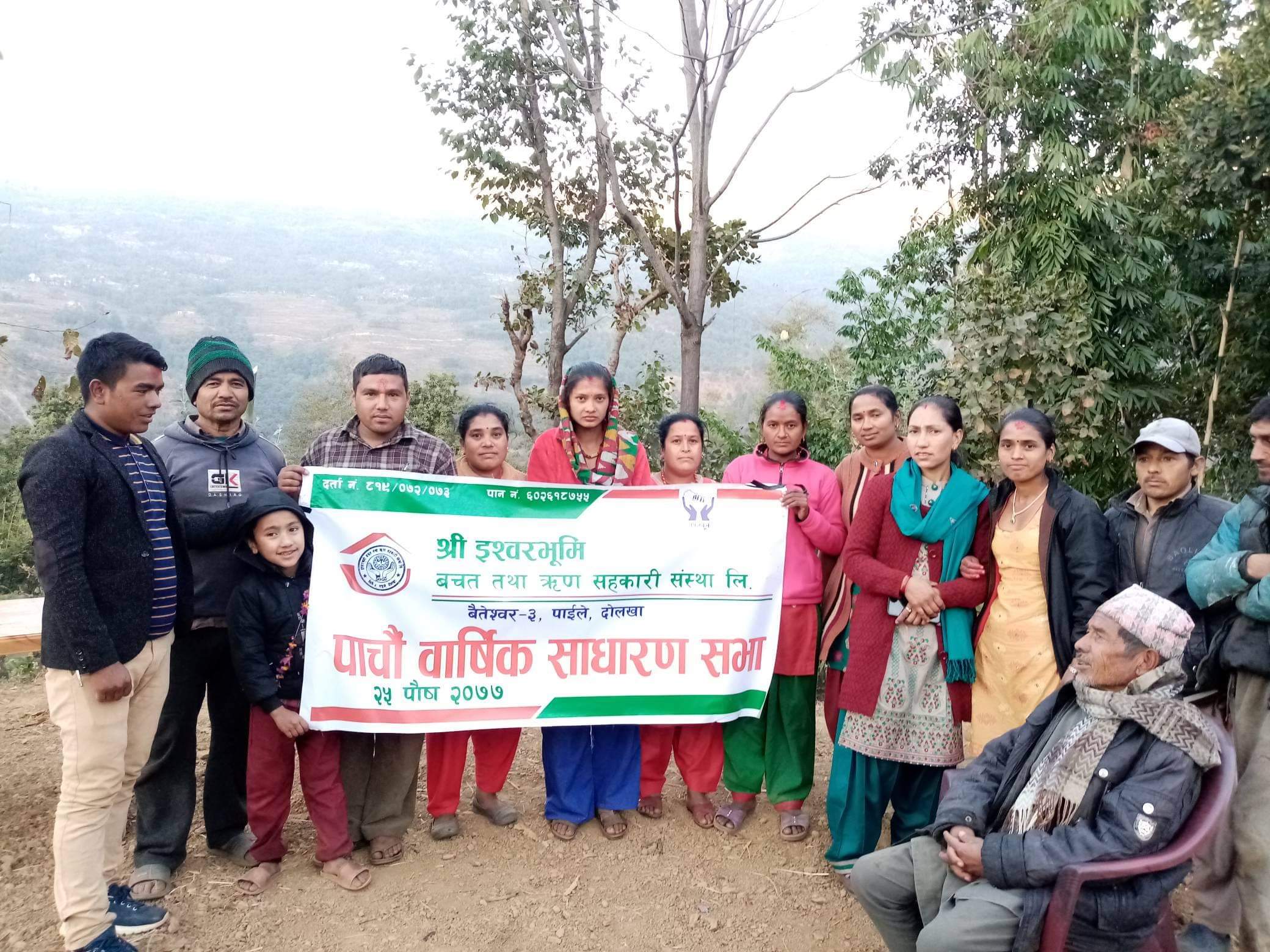 दोलखाको बैतेश्वर गाउँपालिका वडा नम्बर ३ मिर्गेमा रहेको इश्वर भुमि बचत तथा ऋण सहकारी संस्थाको ५औ बार्षिक साधारणसभा सनिवार सम्पन्न भएको छ।सहकारीसाधारणसभा संस्थाका अध्यक्ष सुबास बस्नेतको अध्यक्षयतामा सम्पन्न भएको हो। साधारणसभामा संचालक समितीको प्रतिवेदन सचीव मन्दिरमा भण्डारीले प्रस्तुत गरेकी थिइन्।त्यसैगरी साधारणसभामा सहकारीको आर्थिक वर्ष २०७६|०७७ को प्रगति विवरणको आर्थिक प्रतिवेदन संस्थाका कोष अध्यक्ष ढाल बहादुर बस्नेत ४२ लाख ९६ हजार एक सय ८४ रुपैयाँ बराबरको प्रतिवेदन प्रस्तुत गरेका थिए।सहकारीको सेयर पुर्जी ३ लाख १६ हजार सात सय रुपैयाँ पुगेको छ।त्यसैगरी संस्थाको नाफा १ लाख ३२ हजार,तीनसय रहेको छ।सदस्य संख्या ३३२ जना र बालसदस्य ३०जना गरि तीन सय ६२ जना आवद्ध रहेर बचत ऋणको कारोबार गर्दै आएका छन्।साधारणसभा बैतेश्वर गाउँपालिका वडा नम्बर ३ मिर्गेका कार्यबाहक वडा अध्यक्ष कमल अधिकारीको प्रमुख आतिथ्यतामा सम्पन्न भएको हो।
