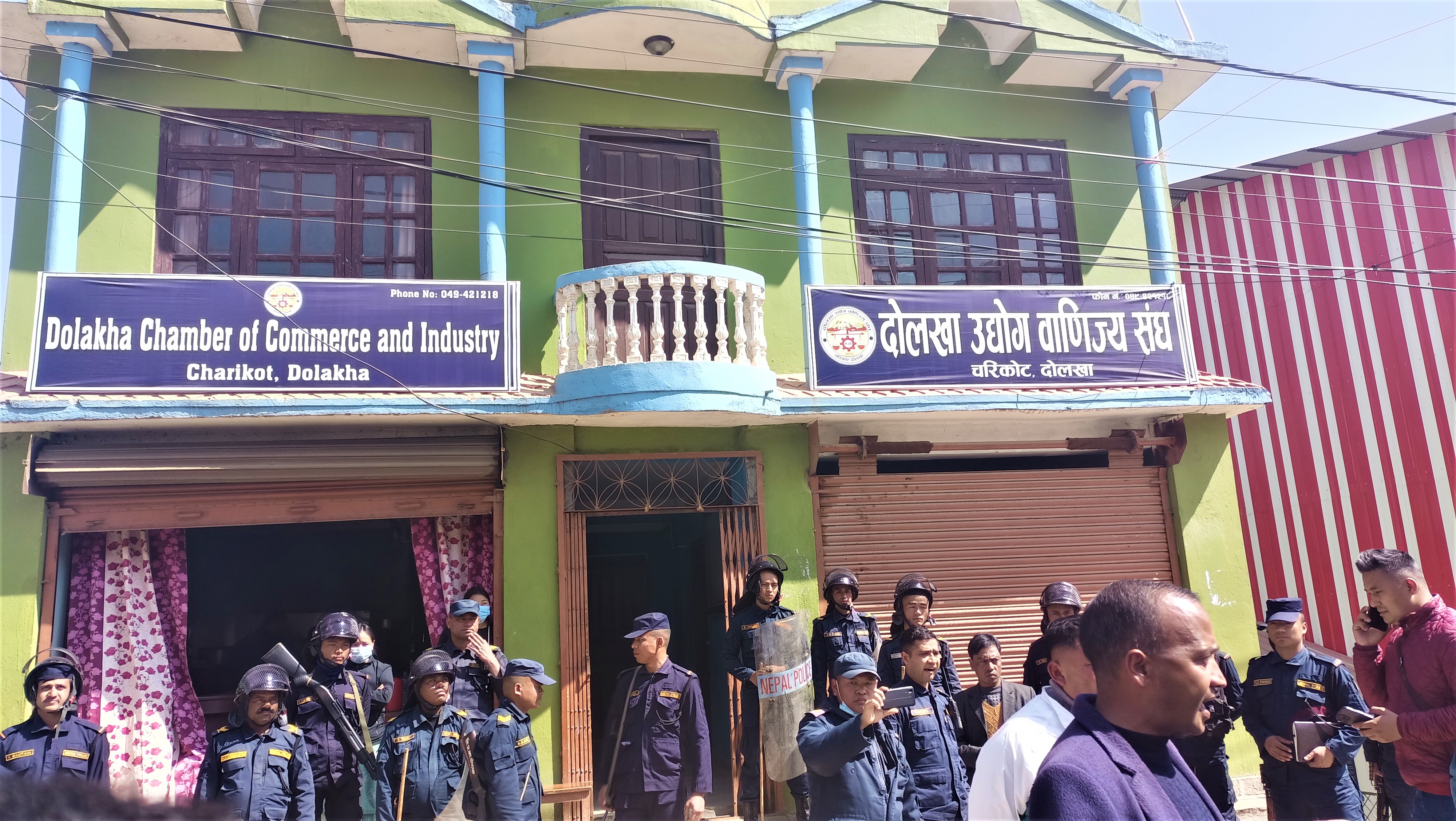 फागुन १३ गतेका २३ औँ अधिवेशनको तयारी गरिरहेको दोलखा उद्योग वाणिज्य संघको कार्यालयमा विहिवार दिउँसो विभिन्न विषयमा असहमती जनाउँदै हालका वहालवाला पदाधिकारी तथा सदस्यहरुले आफ्नै कार्यालयमा तालावन्दी गरेका छन् । चुनावी प्रकृया सुरु गरी उम्मेदवारहरुले उम्मेदवारी समेत दर्ता गरी सकेको अवस्थामा कार्यसमिती आफैले गरेको निर्णयहरुमा असहमती जनाउँदै पदाधिकारी तथा सदस्यहरुले कार्यालयमा तालावन्दी गरेका हुन् । संघले गरेको निणर्यमा वाणिज्य संघमा आवद्ध केहि व्यवसायीहरुले नयाँ थप गरीएको सदस्यता र निर्वाचन समिती गठनको वारेमा विवाद देखाउँदै प्रमुख जिल्ला अधिकारी शेखर पौडेललाई ज्ञापन पत्र वुझाएका छन् ।