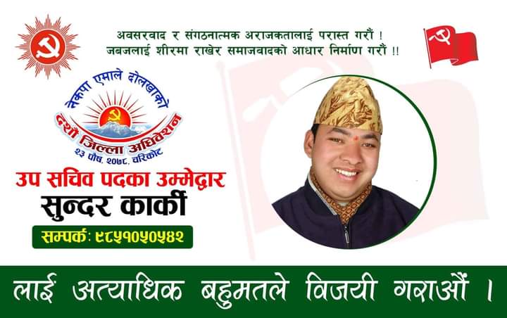 दोलखा । नेकपा एमाले दोलखाको दुई उपसचिव पदमध्ये एक पदका लागि एमालेका युवा नेता सुन्दर कार्कीले उम्मेद्वारी दिनुभएको छ ।