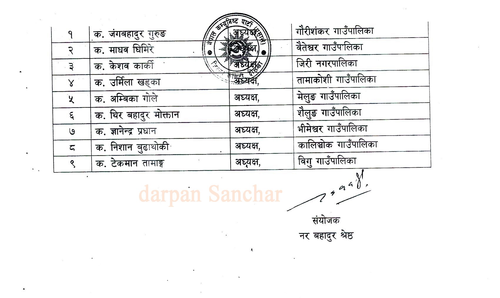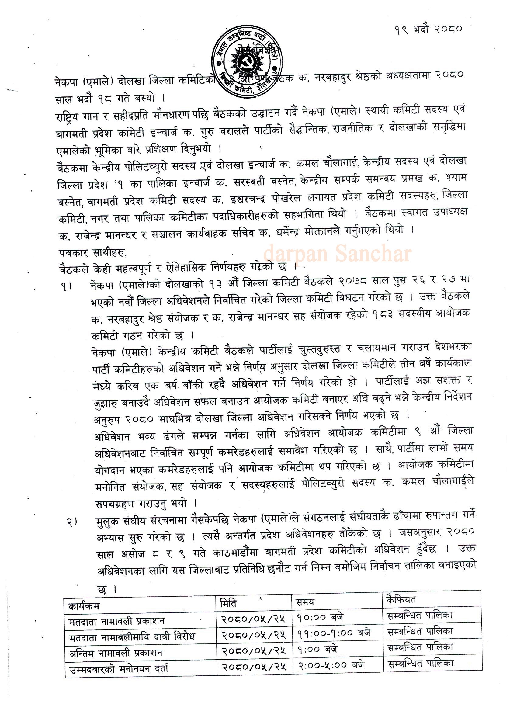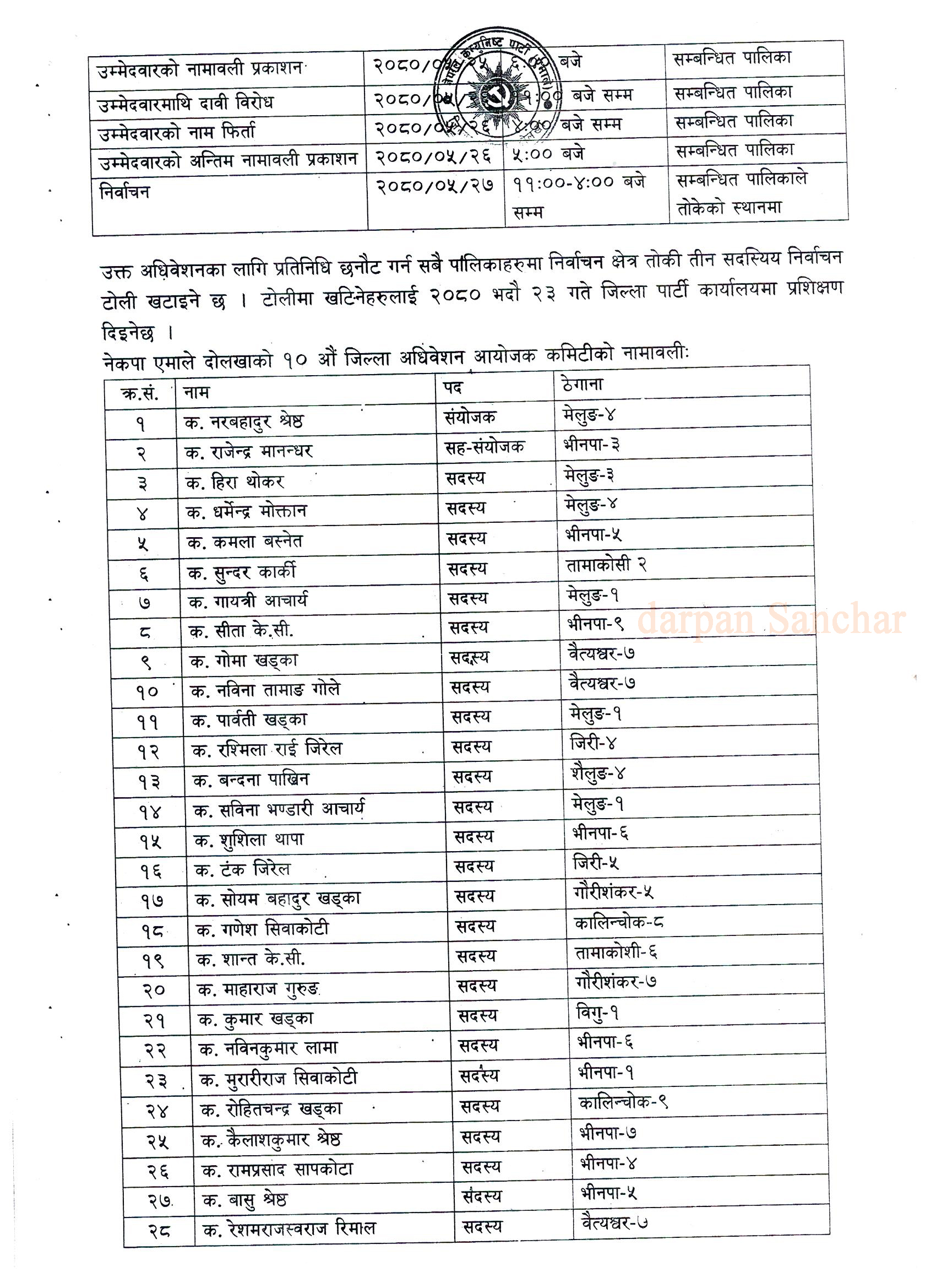 नेकपा एमाले दोलखाको भाद्र १८ गते चरिकोटमा वसेको जिल्ला कमिटी वैठकले गरेको निर्णय सार्वजनिक गर्न आयोजना गरिएको पत्रकार सम्मेलनमा पार्टी अध्यक्ष नर बहादुर श्रेष्ठले आयोजक आयोजक कमिटी गठन गरिएको जानकारी दिनुभयो । भाद्र १८ गते बसेको जिल्ला कमिटी वैठकले १० औँ जिल्ला अधिवेशन गर्नका लागि १८३ सदस्यि आयोजक कमिटीको गठन गरिएको छ । जस्मा पालिका अध्यक्षहरु स्वत पदेन सदस्य रहेको व्यवस्था गरिएको पाटी अध्यक्ष नर बहादुर श्रेष्ठले जानकारी दिनुभयो । अधिवेशन आयोजक कमिटीको संयोजक नर बहादुर श्रेष्ठ र सह संयोजक राजेन्द्र मानन्धरलाई तोकिएको छ ।