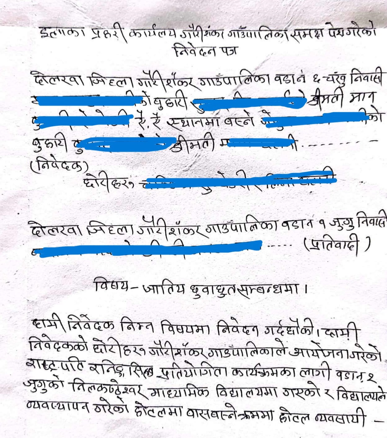 आफुहरु वस्ने होटलमा होटल व्यवसायीले जात के हो भनि सोधेको र आफुहरु विश्वकर्मा भने पछि विश्वकर्मालाई घर भित्र राख्न नहुने भन्दै निकालिएको पिडितहरुले निवदेनमा उल्लेख गरेका छन् । गौरिशंकर गाउँपालिकाले पालिकाको आयोजना र निलकण्ठेश्वर माध्यमिक विद्यालयको व्यवस्थापनमा जुंगुमा पाँचौ अन्तर पालिका स्तरीय राष्ट्रपति रनिङ शिल्ड प्रतियोगिताको आयोजना गरेको थियो । स्थानिय सरकारले संचालन गरेको कार्याक्रममा नै व्यवसायीक रुपमा संचालन गरेको होटल व्यवसायीले दलित रहेकै कारणले विभेद गरेको भन्दै छुवाछुत कसुर अन्र्तगत कारवाहीको माग गरेको छ । पिडितहरुले दोषीमाथि कारवाहीको माग गर्दै इलाका प्रहरी कार्यालय सुरीमा मंगलवार निवेदन पेश गरेका छन् ।