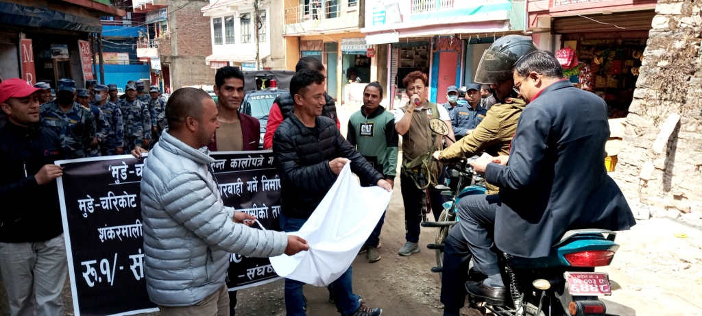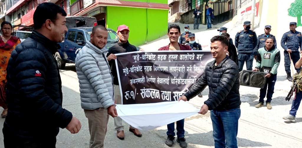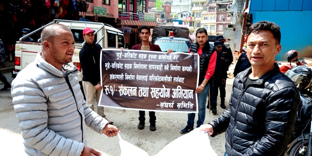 मुडे चरीकोट सडक खण्ड पाँच वर्ष देखि विभिन्न वहानमा निर्माण कम्पनीले अलपत्र पारेर काम नगरेको भन्दै नागरिक समाज तथा संघर्ष समितिले विरोध गर्दै एक रुपौया सहयोग संकलन गरि निर्माण कम्पनीलाई हस्ताणतरण गरेको हो । ७ सय ४ जना नागरिकहरुबाट रु एक एक रुपौया संकलन गरि जम्मा भएको रु ७०४ रुपौया लामोसांघु चरिकोटक सडक निर्मांण आयोजना कार्यालयका प्रमुख दिप वराहीलाई हस्ताण्तरण गरिएको छ । मुडे चरिकोट सडक खण्ड पाँच वर्ष देखि निर्माणको जिम्मा लिएर भत्काएको र समयमा कालोपत्रे नगरि निर्माण कम्पनी संग रकमको अभाव भएर सडक अलपत्र पारेको भन्ने सुन्नमा आएको हुँदा नागरिकहरुबाट सहयोग स्वारुप रु एक रुर्पाैया संकलन गरि निर्माण कम्पनीलाई दिएको नागरिक समाज दोलखा संयोजक चिरञ्जीवि मास्केले बताउनु भयो । सडक भत्काएर मात्र छाडेको र वर्षामा हिलामम्मे हुने र हिउँदको समयमा धुलाम्य हुनुका साथै सडक कालोपत्रे गर्ने उपयूक्त समयमा समेत निर्माण कम्पनीले काम सुरु नगरे पछि कम्पनीलाई आर्थिक अभाव भएको भन्ने सुन्नमा आएको हुँदा विरोध स्वरुप रकम संकलन गरि ठेकेदारलाई सहयोग गरेको संघर्ष समितिदे जनाएको छ ।