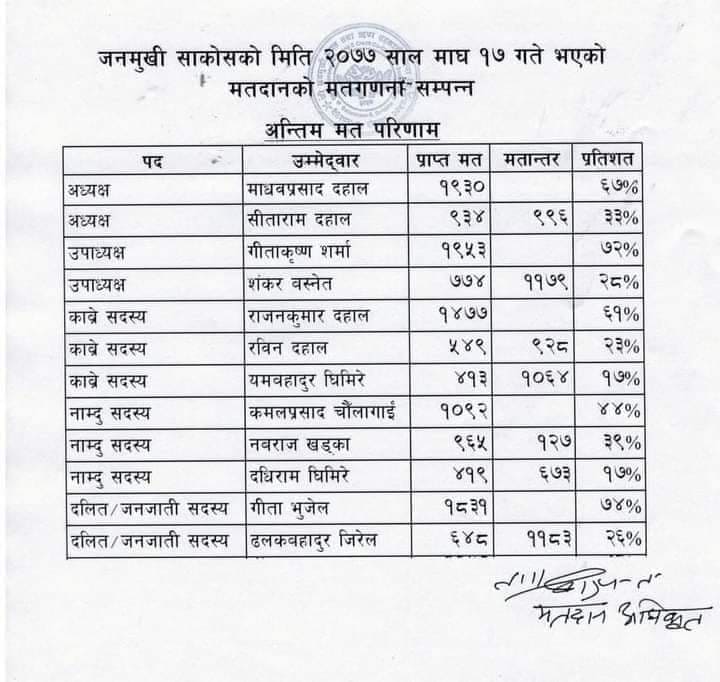 दोलखाको जनमुखी बचत तथा ऋण सहकारी संस्थाको अध्यक्षमा प्रचण्ड नेपाल समुहलाई फराकिलो मतान्तरल पराजित गर्दै ओली सम्ुहका माधव प्रसाद दहाल निर्वाचित भएका छन् ।