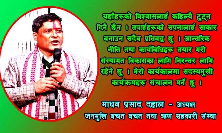 जनमुखी सहकारिमा हालै सम्पन्न निर्वाचन बाट अत्याधिक बहुमतले अध्यक्षमा बिजयी हुनुभएका माधब प्रसाद दहाल संग संस्थाको आगमी योजनाको बारेमा दर्पण संचारले गरिएको कुराकानी