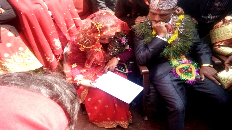 प्रहरीले विशेष सुराकीको आधारमा मेलुङ वडा नम्वर ३ मा आज भई रहेको विहेको मण्डपमानै पुगेर १८ वर्षिय किसोरी संग हुन लागेको विवाह रोकेको छ । मेलुङकै वडा नम्वर ४ भेडपुका ललितबहादुर थापाका २३ वर्षिय छोरा विवेक थापाले परम्परागत रुपमा लगान गाँठो कसेर रित बहादुर कार्कीको १८ बषिय छोरीलाई घर भित्राउनका लागि तयारी गरि रहेका थिए । विशेष सुराकीको आधारमा कम उमेरमा नै बाल विवाह गराउन लागेको भन्ने सुचनाको आधारमा प्रहरी धमाधम विवाह भई रहेको स्थालमा पुगी सोघखोज गर्दा किसोरीको उमेर नुपेको पाइएकाले विवाह रोकिएको दोलखा प्रहरी प्रमुख रेवती रमण पोखरलेलले बताउनु भयो ।