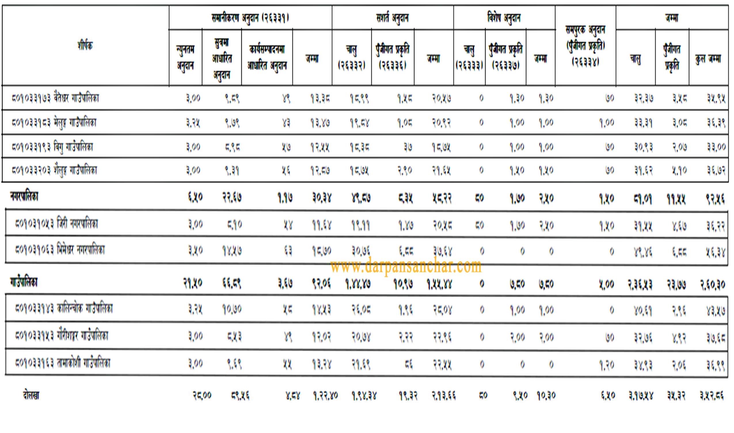 तामाकोशी गाउँपालिकाकाको लागि चालु तर्फ ३४ करोड ९३ लाख पुजिंगत तर्फ २ करोड ६ लाख गरी कुल ३६ करोड ९ढ लाख, वैतेश्वर गाउँपालिकाको लागि चालु तर्फ ३२ करोड ३७ लाख पुजिगत तर्फ ३ करोड ५८ लाख गरी कुल, ३५ करोड ९५ लाख, मेलुङ गाउँपालिकाको लागि चालु तर्फ ५५ करोड ३१ लाख पुजिगत तर्फ ३ करोड ८ लाख गरी ३६ करोड ३९ लाख, विगु गाउँपालिकाको लागि चालु तर्फ ३० करोड ९३ लाख पुजिगत तर्फ २ करोड ७ लाख गरी कु्ल ३३ करोड र शैलुङ गाउँपालिकाको लागि चालु तर्फ ३१ करोड ६२ लाख पुजिगत तर्फ ५ करोड १० लाख गरी कुल ३६ करोड ७२ लाख रकम विनियोजन भएको छ ।
