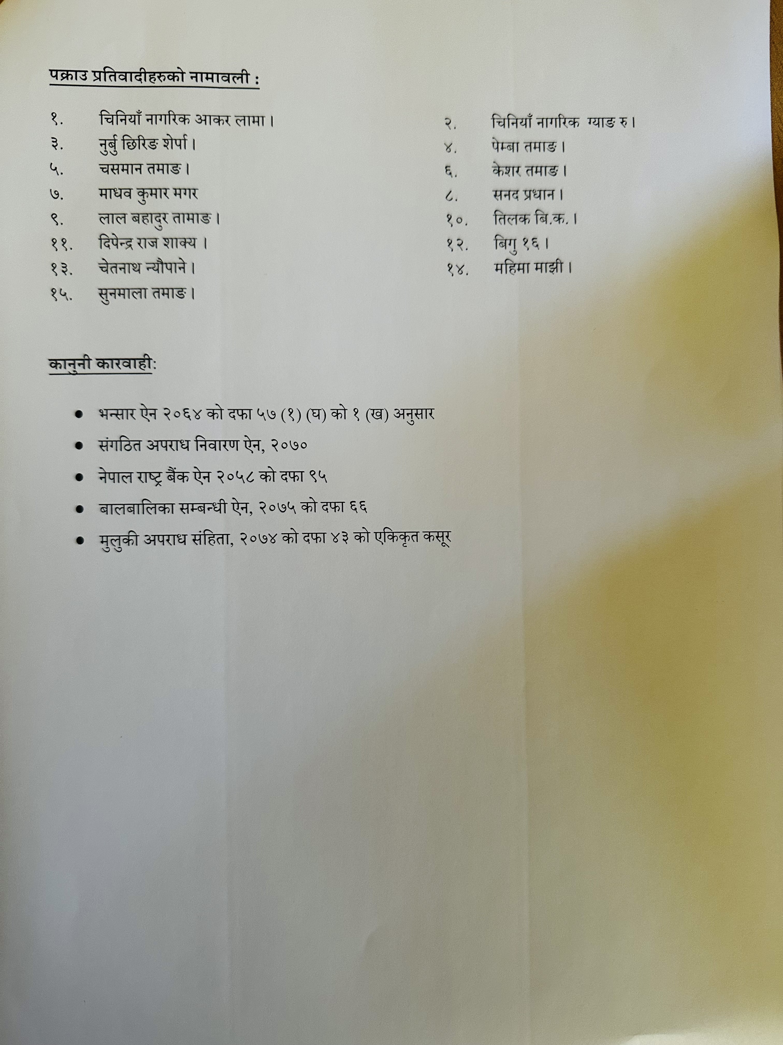 उनिहरु उपर भन्सार ऐन २०६४ को दफा ५७ (१) (घ) को १ (ख), संगठित अपराध निवारण ऐन २०७०, नेपाल राष्ट्र बैंक ऐन २०५८ को दफा ९५, बालबालिका सम्बन्धि ऐन २०७५ को दफा ६६ र मुलुकि अपराध संहिता २०७४ को दफा ४३ को एकिकृत कसुरमा मुद्धा चलाइने प्रहरीले जनाएको छ ।