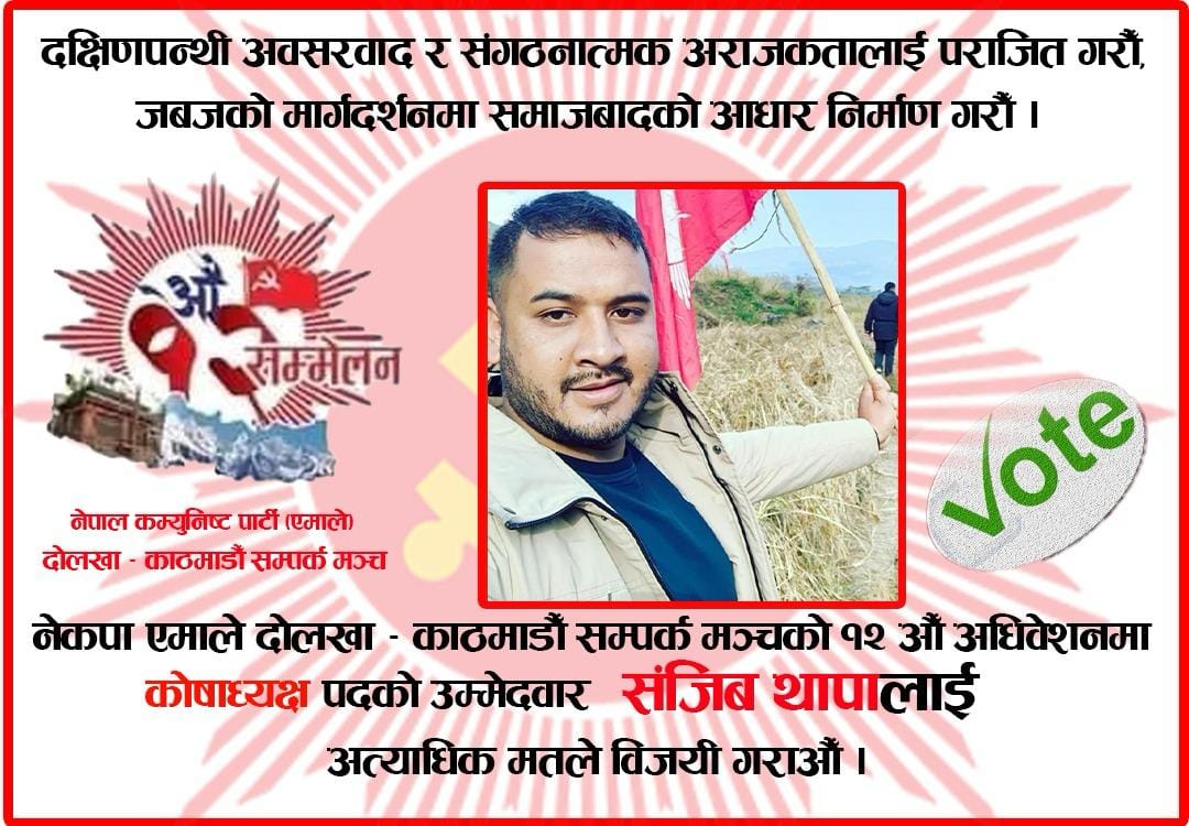 नेकपा एमाले दोलखाका काठमाण्डौ सम्पर्क मञ्चको कोषाध्यक्ष पदमा युवा नेता संजीव थापाले उम्मेदवारी दिनुभएको छ ।