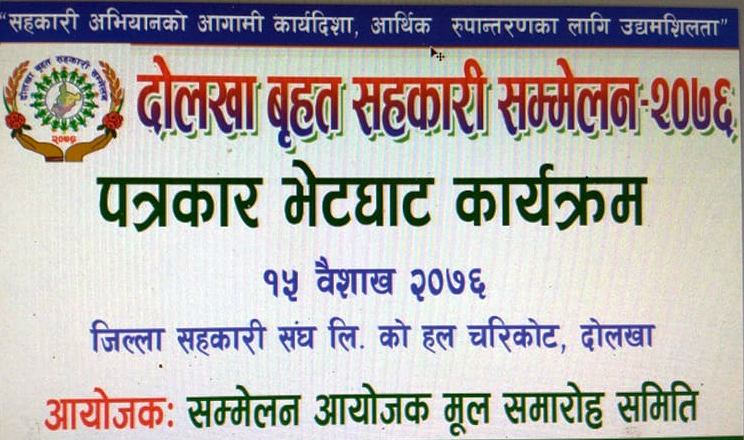 जिल्लाको सदरमुकाम चरिकोटमा वैशाख २७ र २८ गते दुई दिन सहकारी संघ दोलखा र दोलखा वचत तथा ऋण सहकारी संघको संयुक्त आयोजनामा दोलखा बृहत सहकारी सम्मेलन हुन लागेको हो ।