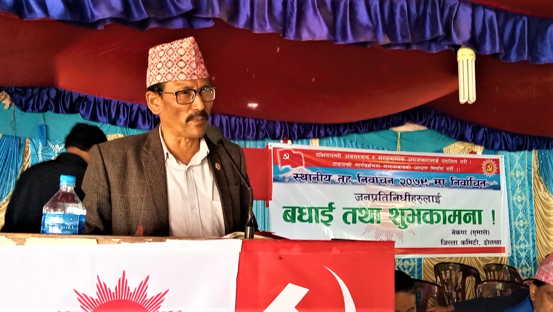 नेकपा एमाले दोलखाले जिल्लाको स्थानिय तहहरुमा नेकपा एमालेका नवनिर्वाचित प्रमुख तथा उपप्रमुख, अध्यक्ष तथा उपाध्यक्ष, डाअध्यक्ष तथा वडा सदस्यहरुलाई खादा र अबिर लगाई जिल्लाका अध्यक्ष नर बहादुर श्रेष्ठ, एमाले पोलिटब्युरो सदस्य एवं पुर्वमन्त्री पार्वत गुरुङ, नेकपा एमालेका पोलिटव्युरो सदस्य आनन्द प्रसाद पोखरेल, केन्द्रिय सदस्य रचना खड्का, वागमती प्रदेश कमिटी सदस्य लगाएतले आगामी ५ बर्षिय कार्यकालको लागि बधाई तथा शुभकामना व्यक्त गर्नु भएको थियो ।