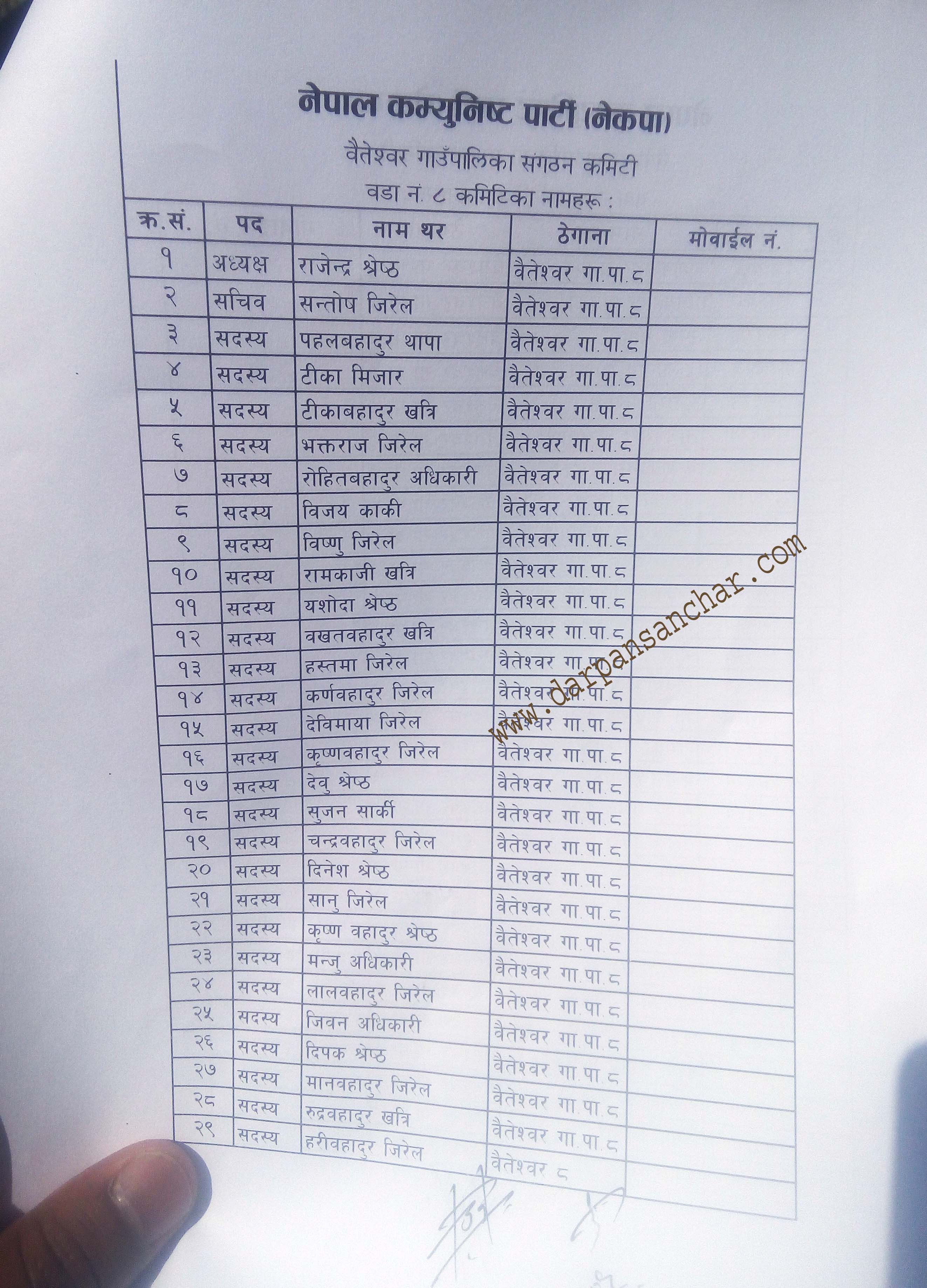 वडा ६ नारायण थापा अध्यक्ष कृष्णथापा सचिव