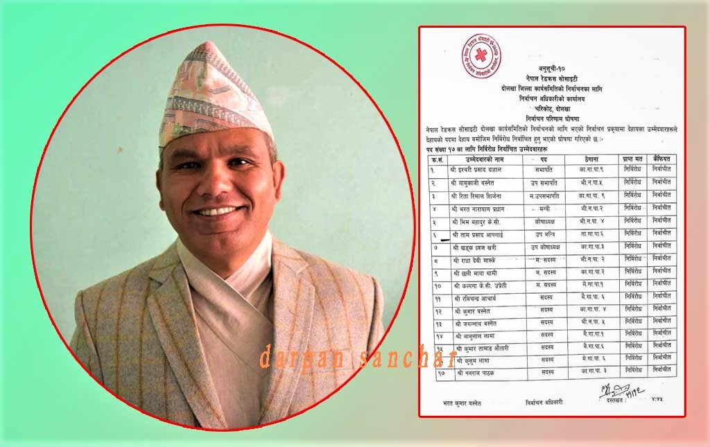 दोलखाको सदरमुकाम चरिकोटमा आज भएको शाखाको ४१ औं जिल्ला सभा तथा १३ औ अधिवेशनबाट इश्वरी प्रसाद दाहालको सभापतित्वमा नयाँ कार्यासमिति चयन गरेको हो । नेपाल रेडक्रस सोसाइटी दोलखा शाखाको उप–सभापतीमा बाबुकाजी बस्नेत, महिला उप–सभापतीमा रिता रिमाल (सिर्जना), मन्त्रीमा भरत नारायण प्रधान, कोषाध्यक्षमा भिम बहादुर केसी, उप–मन्त्री ताम प्रसाद आपागाई, उप–कोषाध्यक्षमा खड्क ध्वज खत्री चयन हुनुभएको छ । त्यसैगरी सदस्यहरुमा राधा देवि मास्के, छलिमायाँ थामी, कल्पना केसी, रविचन्द्र आचार्य, कुमार वस्नते, जगन्नथ वस्नेत, बावुलाल लामा, कुमार तामाङ, कुसुम लामा, नवराज पाठक चयन हुनुभएको निर्वाचन समितीले जनाएको छ ।