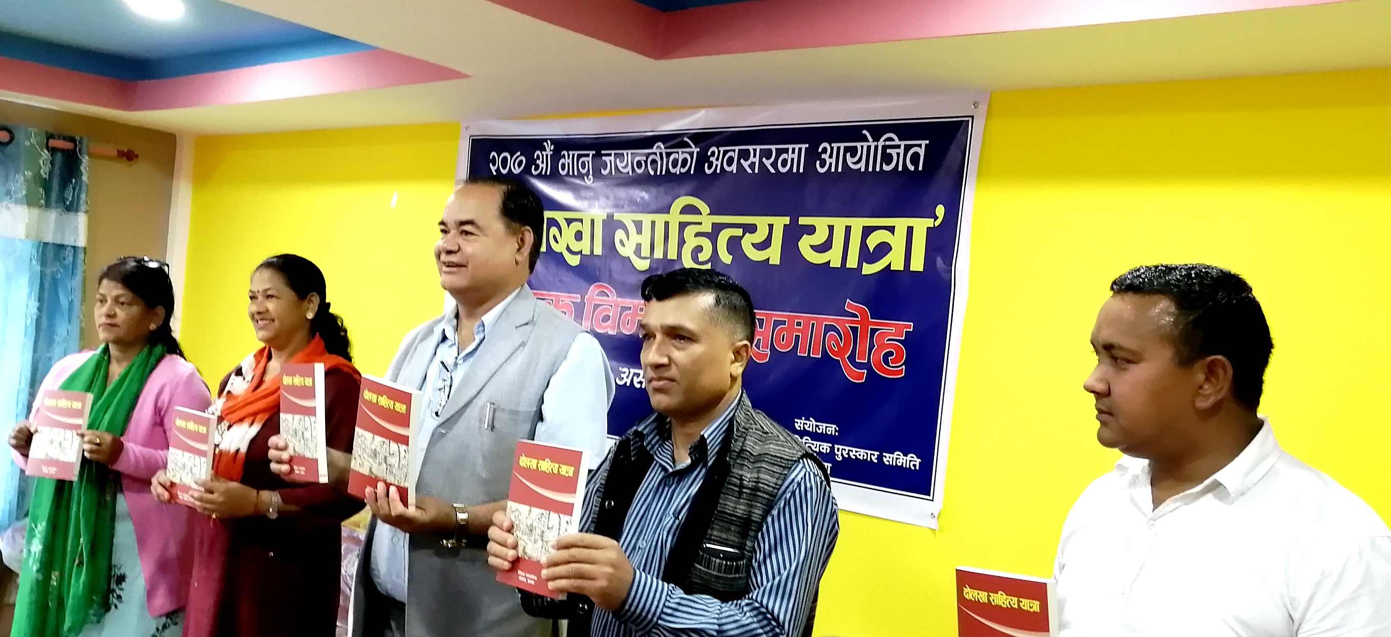 भानु जयन्तीको अवसरमा विष्णुलक्ष्मी साहित्य पुरस्कार समिती संगको सहकार्यमा भिमेश्वर नगरपालिकाले प्रकाशन गरेको पुस्तक दोलखा साहित्य यात्रा आज सार्वजनिक गरेको हो । भिमेश्वर नगरपालिकाका प्रमुख भरत बहादुर केसी, प्रमुख जिल्ला अधिकारी भिमकान्त शर्मा, उप प्रमुख कमला वस्नेतले पुस्तकको विमोचन गर्नु भएको थियो । पुस्तकमा दोलखाका श्रष्ठाहरुको कृती समावेश गरिएको छ ।
