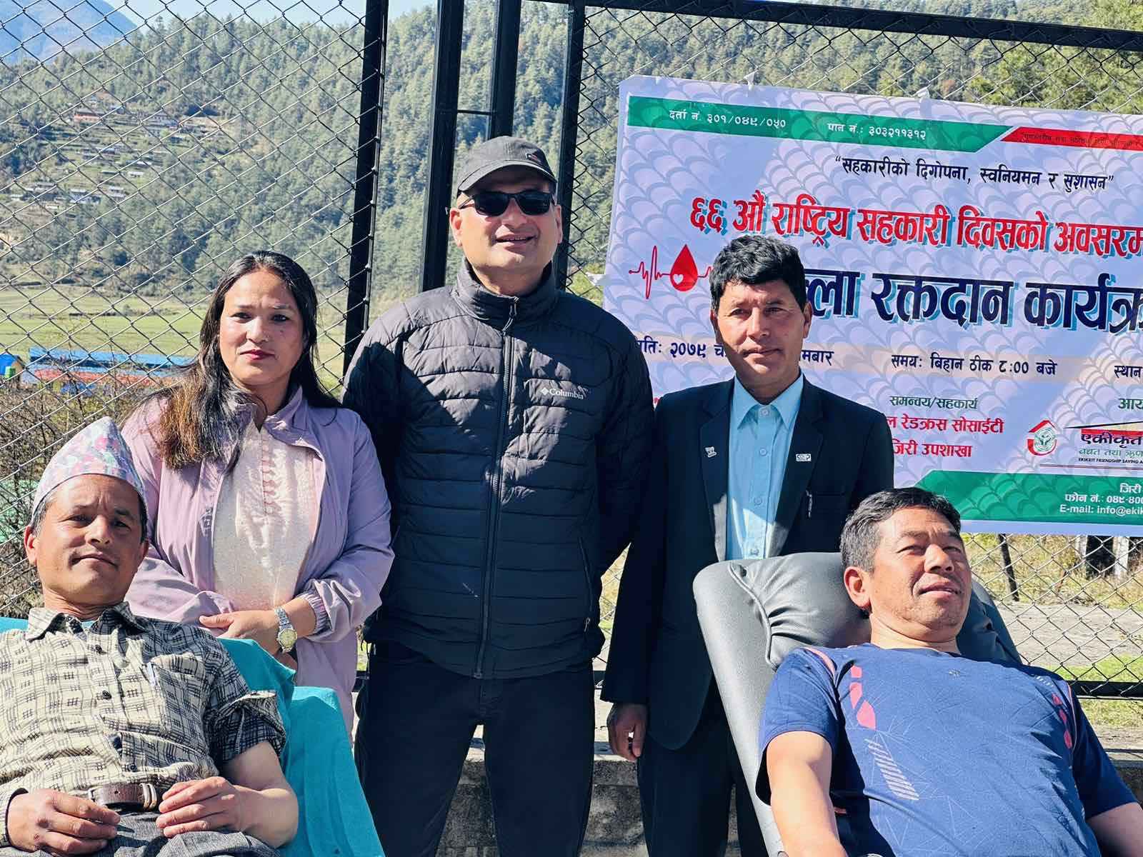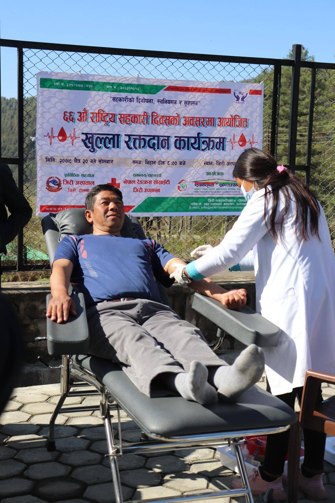 सहकारी संस्थाले ६६ औँ राष्ट्रिय सहकारी दिवसको अवसरमा रक्तदान कार्यक्रमको आयोजना गरेको हो । एकीकृत फ्रेण्डसिप बचत तथा ऋण सहकारी संस्थाको आयोजना तथा नेपाल रेडक्रस सोसाईटी जिरी उपशाखाको समन्वय तथा जिरी अस्पतालको प्राविधिक सहयोगमा भएको रक्तदान कार्यक्रममा १० जनाले रक्तदान गर्नुभएको थियो । सहकारीको दिगोपना ः स्वनियमन र सुशासन भन्ने मुल नाराका साथ मनाईएको खुल्ला रक्तदान कार्यक्रममा सहकारी संस्थाका सञ्चालक, कर्मचारीहरु र शेयर सदस्य गरि करिब ५० जनाले ब्लड गु्रप पहिचान समेत गर्नु भएको र आवश्यक परि अपस्पतालले समन्वय गर्दा पुन रगत दिने गरि तयारी गरिएको संस्थाका का.मु प्रमुख कार्यकारी अधिकृत राम बहादुर खत्रीले जानकारी दिनुभयो । दोलखा, रामेछाप र सोलुखुम्बु जिल्लाका बिरामीहरुको उपचार गर्दै आएको अस्पतालमा रगत अभावका कारण कोही पनि बिरामीको मृत्यु नहोस् भन्ने उद्देश्यले आज रक्तदान कार्यक्रमको आयोजना गरिएको संस्थाका उपाध्यक्ष केदार बहादुर जिरेलले जानकारी दिनुभयो । उहाँका अनुसार बर्षै पिच्छे मनाईने गरेको सहकारी दिवस कार्यक्रम यो बर्ष भने अलि नयाँ पनका साथ मनाईएको हो ।
