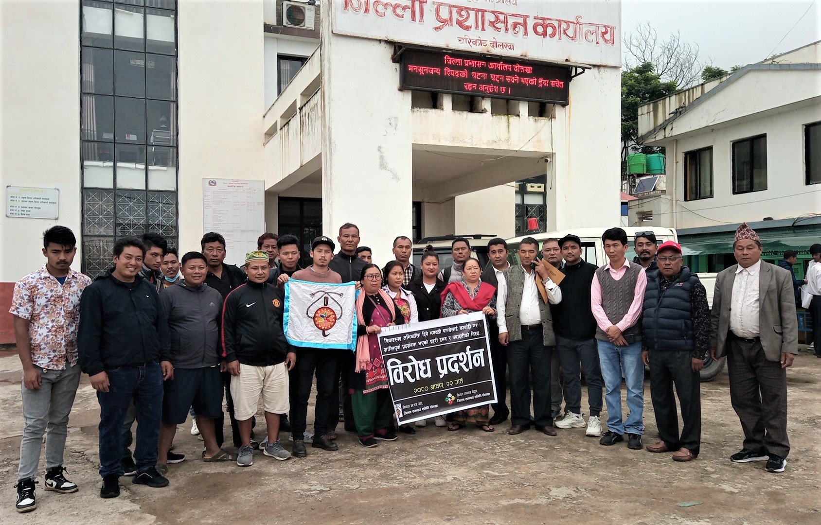 गत श्रावण १७ गते जिल्ला प्रहरी परिसर टेकुमा नेपाल तमाङ घेदुङ र नेपाल मगर संघले धर्ना दिएको थियो । उक्त एक घण्टे धर्ना कार्यक्रमलाई शान्ति पूर्ण ढंगले सम्पन्न गर्ने क्रममा प्रहरीले अनावाश्यक वल प्रयोग गरी चार दर्जन भन्दा वढी पक्राउ गर्नुका साथै लाठी चार्ज, रड समेत प्रयोग गरेको भन्दै संघहरुले आज देश भरी प्रमुख जिल्ला अधिकारी मार्फत ध्यानाकर्षण गराएको हो ।