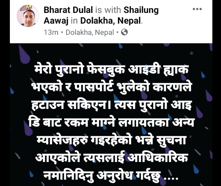 दोलखाको शैलुङ गाउपालिका प्रमुखको फेसबुक आइडी ह्याक गरेर विभिन्न ब्याक्तीलाई गलत म्यासेज गरि रहेको पाइएको छ ।