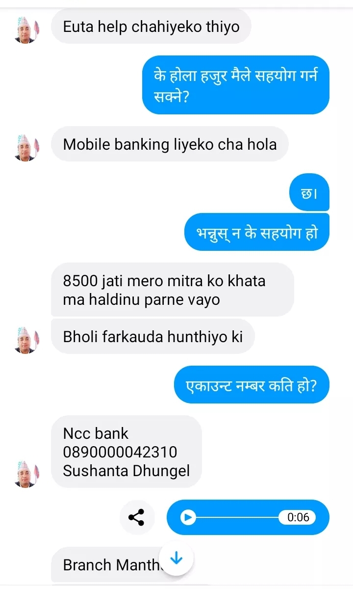 पालिका प्रमुख भरत दुलाललको फेसबुक आइडी ह्याक गरेर फेसबुकमा रहेका विभिन्न साथी हरुलाइ रकम माग गरि रहेको र विभिन्न ब्यतिलाइ गलत म्यासेज गरि रहेको पाइएको छ । फेसबुक ह्राक गरेर अति समस्या परेको भन्दै विभिन्न ब्यतीक बैक खातामा पैसा हालिदिन म्यासेज गरि रहेको पाइएको छ । म्यासेजकै आधारमा विभिन्न ब्यती हरुले रकम समेत जम्मा गरि दिएको पाइएको छ । गाउपालिका प्रमुखकै फेसबुक एकाउन्टबाट रकमको अभाब भएको र साथिको खाता नम्बरमा सहयोग गर्न आग्रह गरे पछि आफुले ८ हजार ५ सय रकम मोबाइल बैकिङ मार्फत जम्मा गरि दिएको चरिकोटका ब्यबसायी रेहान स्टोरका प्रोपाइटर राजु केसि ले बताउनु भयो । चरिकोटका होटल ब्यबसायी डृम्स क्याफेका प्रोपाइटर भरत श्रेष्ठ लाई रकम पठाउन आग्रह गरेको र साथीको मोबाइल बैकिङ मार्फत रकम खातामा हालिदेको उहाले बताउनु भयो । तेसै गरि अन्य बिभिन्न ब्याक्ती लाई समेत तेस्तै म्यासेज गरि रहेको पाइएको छ ।