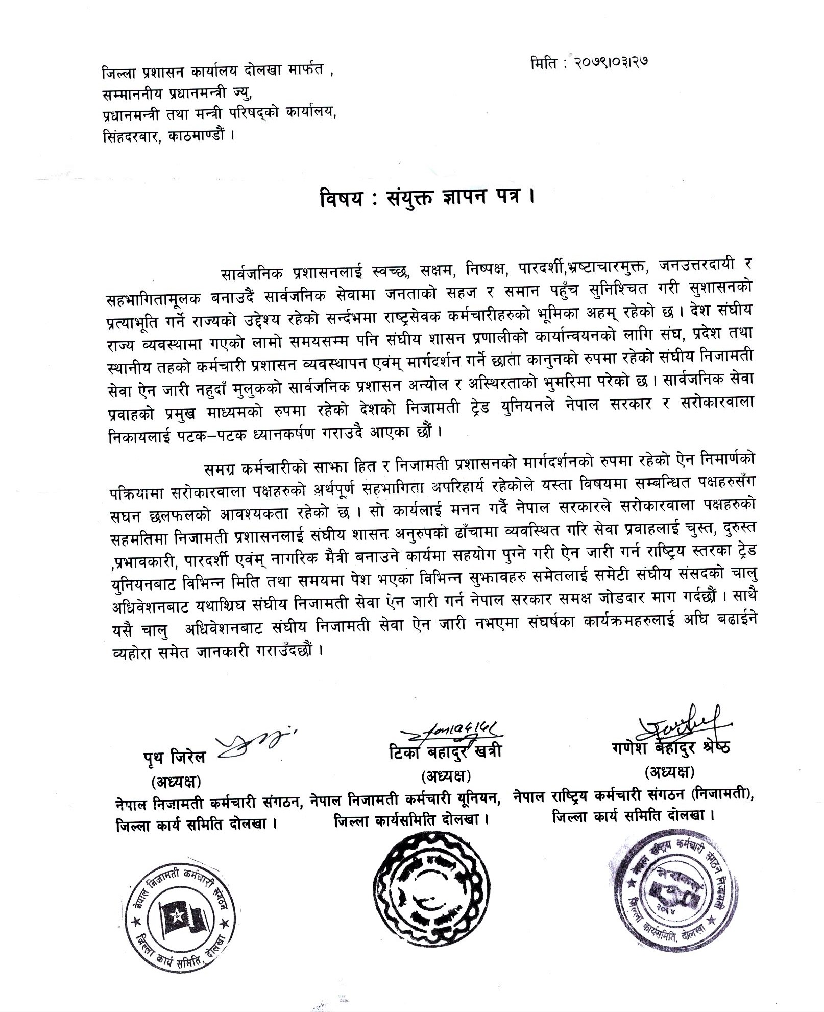 नेपाल निजामती कर्मचराी संडठन, नेपाल निजामती कर्मचारी यूनियन र नेपाल राष्ट्रिय कर्मचारी संगठनले प्रमुख जिल्ला अधिकारी भोजराज खतिवडालाई संयुक्त रुपमा ज्ञापन पत्र बुझाएका हुन् । देश संघियतामा गएको लामो समयसम्म पनि देशमा संघीय निजामती सेवा ऐन जारी नहुँदा मुलुकको सार्वजनिक प्रशासन अन्योल र अस्थिरताको भुमरीमा परेको नेपाल निजामती कर्मचारी संगठन दोलखाका अध्यक्ष पृथ जिरेलले बताउनु भयो ।