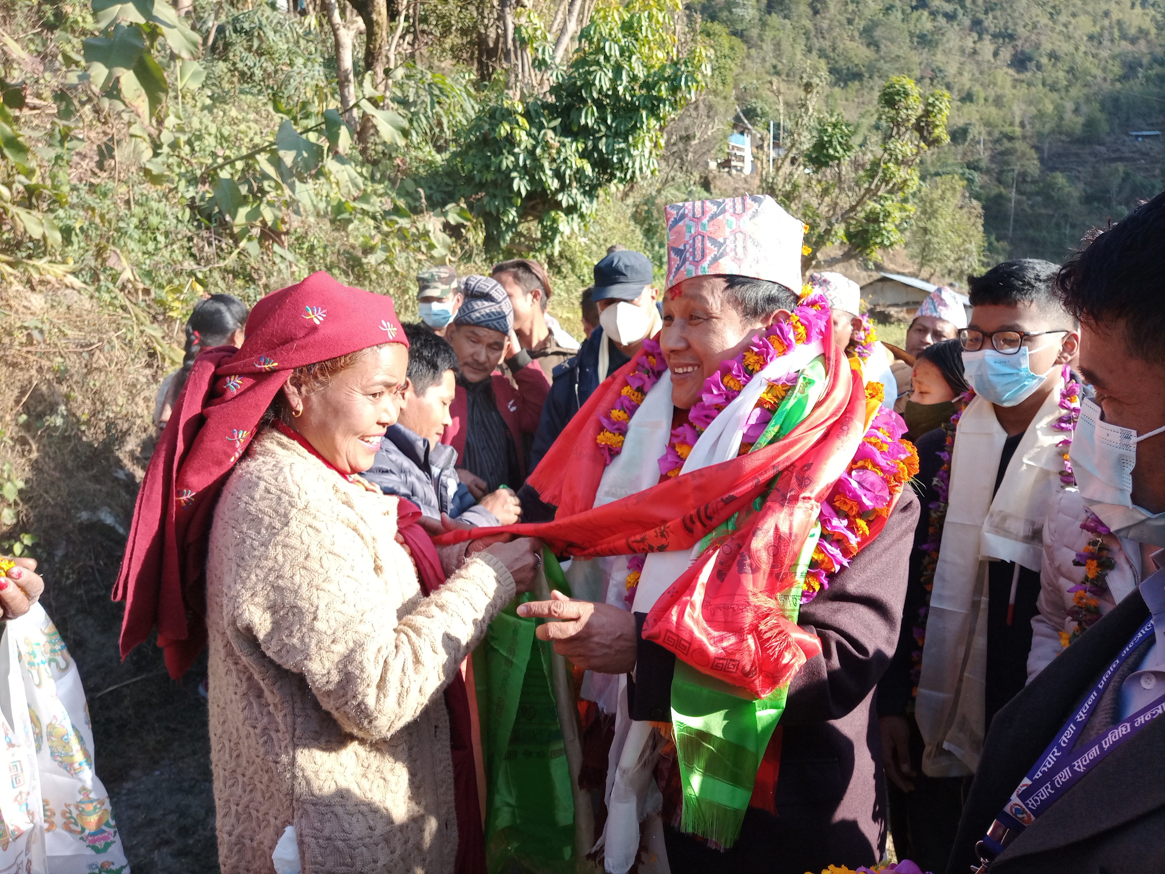 दोलखाको विभिन्न कार्याक्रमा सहभागी हुन दोलखा आउनु भएको मन्त्री गुरुङलाई जिल्लाको बिभिना कार्यक्रम आज भब्य स्वागत गरेको छ । जन्म गाउँ गौरिशंकर गाउपालिका सुरिमा गाउपालिकाले आज बधाई तथा सम्मान गरेको छ । गाउपालिका ५ सुरि काप्तीमा रहेको दिब्यश्वोरो आधारभूत बिधालय को नब निर्मित भवनको उदघाटन गर्नु भएको छ । उदघाटन तथा हस्तान्तरण कार्यक्रममा सम्बोधन गर्नु हुँदै मन्त्री गुरुङले निर्वाचन देखि सहयोग गरि यो अबस्था सम्म पुर्याउनु सहयोग गर्नु सबैको महत्त्वपूर्ण भुमिका रहेको ले सबैलाइ धन्यवाद दिनु भएको थियो । जन्म गाउँ काप्ती आइ पुग्नु भएका मन्त्री गुरुङले जेष्ठ नागरिकहरुलाइ न्यानो कपडा बितरण गर्नु भएको थियो । संचार मन्त्री हुनु भएसी पहिलो पटक आज गृह जिल्ला आउनु भएको मन्त्री गुरुङको ६ गते सम्म जिल्लाको विभिन्न कार्यक्रमा सहभागी हुने कार्यक्रम रहेको छ ।