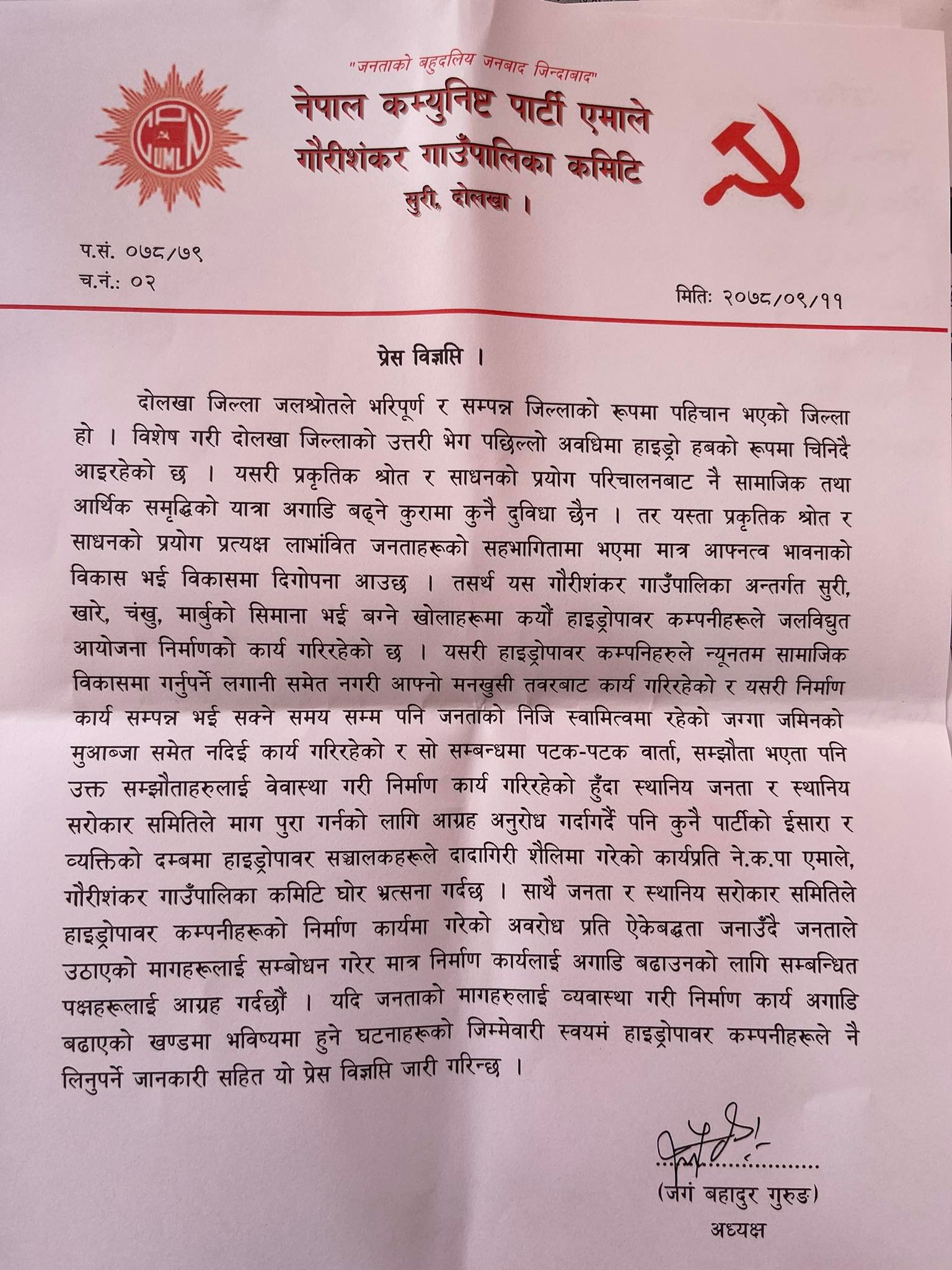 हाइड्रोपावर कम्पनीहरुले स्थानिय तथा प्रभावित क्षत्रका नागरिकहरुको जयज मागहरुको सम्वोधन नगरी मनपरी तरिकाले काम गरेको र सरोकार समिती संग गरेका लिखित तथा मौखिक सम्झौताहरु कार्यान्वयन नगरेको भन्दै हाइड्रो संघर्ष समितिले आन्दोलन गर्दौ आएको छ । नेकपा एमाले गौरिशंकर गाउँपालिका कमिटिका अध्यक्ष जंग बहादुर गुरुङले आज एक विज्ञप्ती जारी गर्दौ सरोकार समितीको माग सम्वोधन हुनुपर्ने भन्दै आन्दोलनमा ऐक्यवद्धता जनाएको हो । सरोकार समितीले आन्दोलन गरे पछि गौरिशंकर गाउँपालिकामा निर्माण सासा हाइड्रोपावर कम्पनी र ग्रिनलाइफ हाइड्रोपावर कम्पनी निर्माणको काम ठप्प भएको छ ।